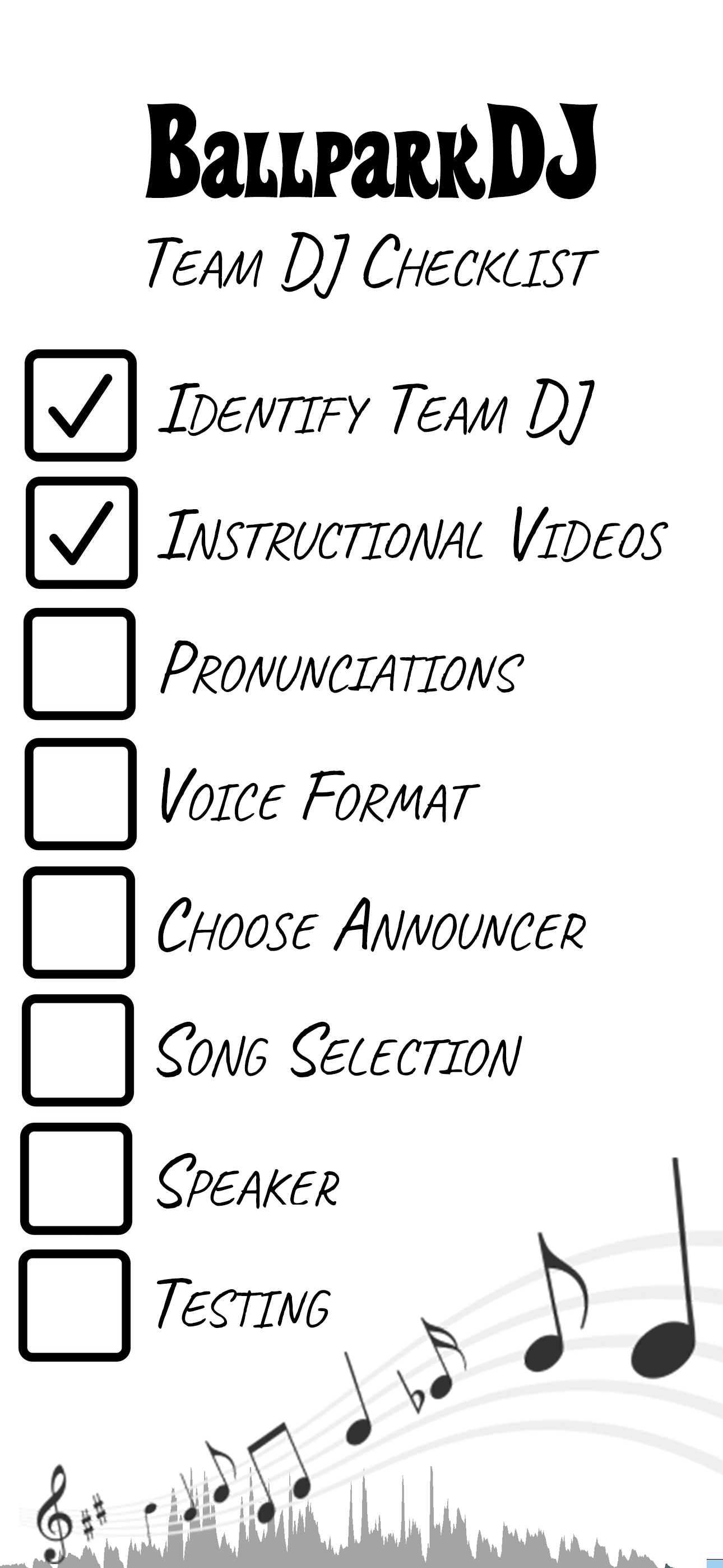 Once your lineup is set and player numbers are assigned, you’re ready to start building your BallparkDJ intros. While you can complete everything in a single day, it’s smart to allow extra time for things like correcting name pronunciations, choosing music, selecting your announcer and voice style, and testing your speaker setup. The preseason checklist below gives you a simple roadmap to follow so you’re fully prepared for opening day.
