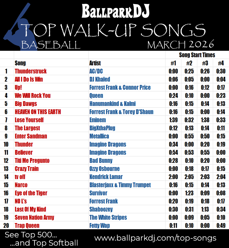 Below are the Top Walk-Up Songs used in BallparkDJ for March 2026. These are the top songs chosen by players on newly created baseball teams during the month of March 2026. This is the definitive list of favorite songs chosen for walk-up intros by boys baseball players.